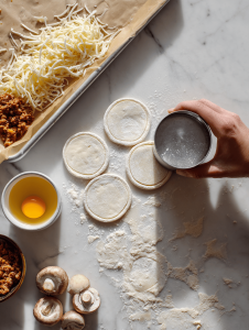 - Prepare filling: Cook sausage, caramelize onions, chop mushrooms, and mix with cheese and herbs.