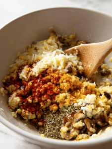 - Mix together the shredded mozzarella, sharp cheddar, cooked sausage, mushrooms, caramelized onions, oregano, garlic powder, red pepper flakes, a splash of lemon juice, and smoked paprika in a bowl to form the filling.