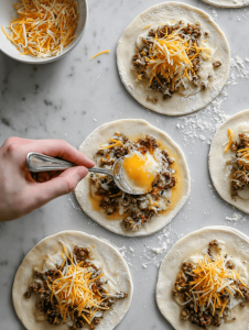 - Spoon a generous dollop of filling into the center of each dough circle, leaving a small border around the edges.