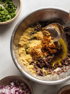 - Add onion, garlic, smoked paprika, lemon juice, and breadcrumbs. Mix well.