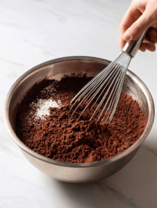 - Mix dry ingredients: cocoa, flour, baking soda, and salt. Stir well.