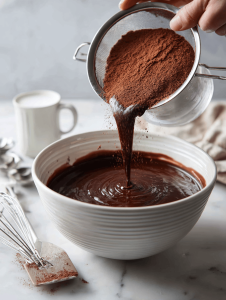 - In a separate bowl, sift together the cocoa powder, flour, baking soda, and salt to ensure even distribution and a lump-free batter.