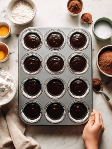 - Preheat your oven to 180°C (350°F) and line a cupcake tin with liners. Measure out your cocoa powder, flour, baking soda, and salt, then set aside.