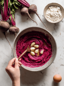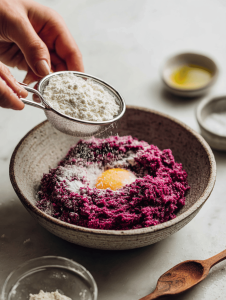 2. In a large mixing bowl, combine the mashed beets with a beaten egg and minced garlic. Mix well until the ingredients are evenly incorporated, and the mixture takes on a vibrant magenta hue.