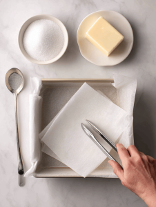 - Line the pan with parchment paper.