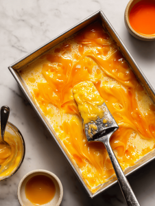 - Pour the hot mixture into your prepared pan, spreading it evenly with the spatula to create a smooth, colorful surface.