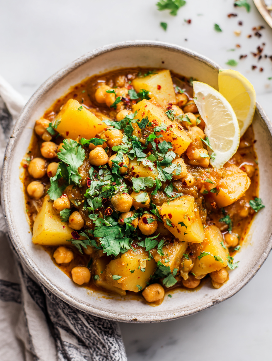 This hearty chickpea potato curry combines tender potatoes and creamy chickpeas simmered in a fragrant tomato-based sauce infused with cumin, turmeric, and garlic. The dish develops a rich, layered flavor with a thick, comforting texture, finished with a splash of coconut milk for added creaminess and brightness.
