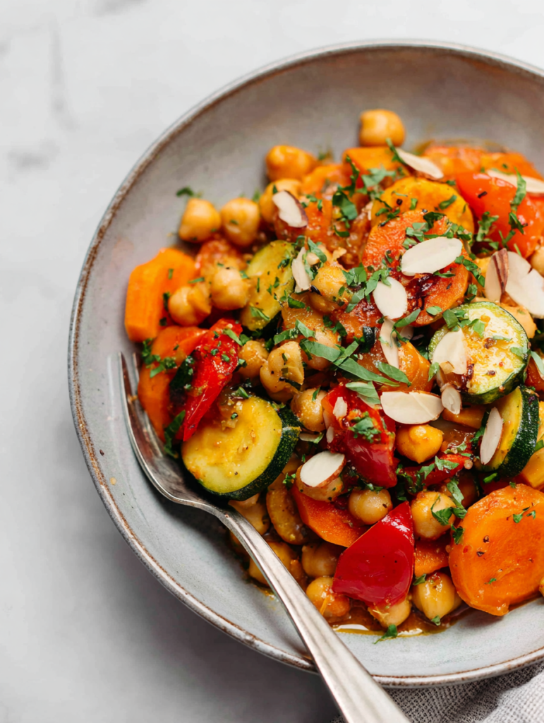 This hearty chickpea vegetable tagine is a slow-simmered dish that combines earthy spices, tender vegetables, and hearty chickpeas. The dish develops a rich, saucy texture with vibrant flavors, finished with bright lemon and salty olives. It’s a comforting, soulful meal perfect for cozy weekends.