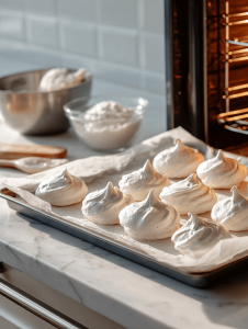 - Turn off the oven and leave the meringues inside with the door slightly ajar to cool and dry completely, which helps them develop their signature crispness.