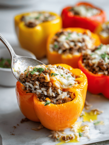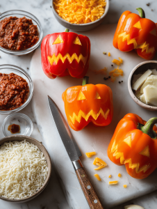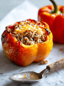 Bright bell peppers are carved into playful faces and filled with a savory mixture of browned ground meat, rice, and cheese. Baked until the peppers are tender and the cheese is bubbly, this dish combines festive presentation with hearty, comforting flavors. The final result is a colorful, crispy-edged pepper with a gooey, flavorful filling that’s perfect for Halloween or any fun dinner occasion.
