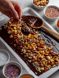- Scatter the toasted nuts evenly across the surface, pressing them lightly into the chocolate for better adherence. The toasted aroma complements the dark chocolate beautifully.