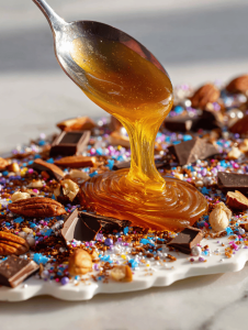 - Drizzle caramel or honey in squiggly lines over the toppings for a glossy, sticky finish. The caramel will add a golden shimmer and extra sweetness.