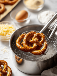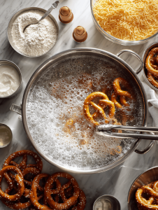 6. Boil water and baking soda. Drop pretzels in for 30 seconds each—watch for foam and shimmer.