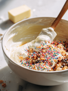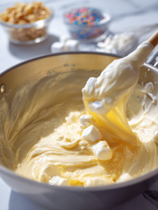 - Quickly fold in the cereal and toppings using a spatula, ensuring everything gets coated evenly in the marshmallow goo.