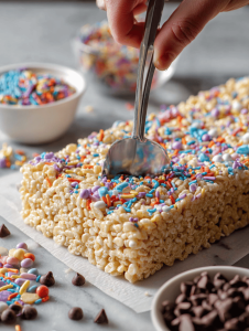 Let the treats cool completely before slicing. Add extra toppings or sprinkles on top, pressing gently for adhesion. Serve in big, messy squares—embrace the goo.