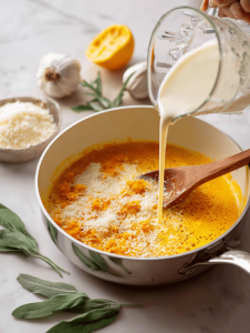 - Pour the heavy cream into a saucepan over medium heat. Warm it gently until it starts to bubble softly, then stir in the pumpkin purée, grated Parmesan, and a pinch of nutmeg. Cook, stirring constantly, for about 5 minutes until the sauce thickens slightly and becomes velvety, with a warm, inviting hue and a fragrant blend of herbs and pumpkin.