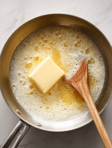 - In a saucepan, melt butter over medium heat (around 150°C/300°F).