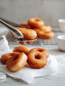 8. Remove the donuts with a slotted spoon and drain on paper towels. Let them cool completely on a wire rack.