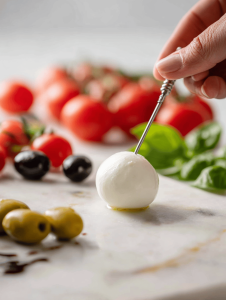 3. Place a mozzarella disk onto a toothpick or small skewer, ensuring it feels firm but not rubbery.