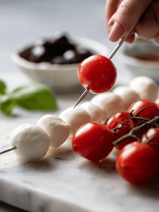 Step 3: Assemble the bites: place a mozzarella disk on a toothpick or small skewer.