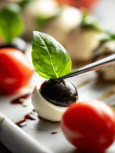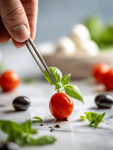 5. Place a small basil leaf atop the cherry tomato, adding a splash of green for contrast.