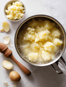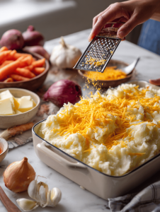 5. Meanwhile, prepare your mashed potatoes by mashing boiled potatoes with butter until smooth and fluffy. Stir in shredded cheddar cheese for extra flavor and a hint of gooeyness. Transfer the mashed potatoes into piping bags or plastic sandwich bags fitted with a large star or round tip.