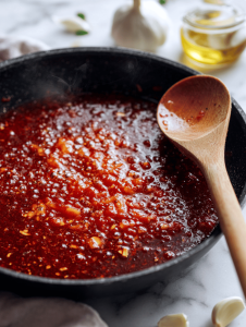 - Pour in tomato sauce, stir in smoked paprika and chili flakes, then bring the mixture to a simmer. Let it bubble gently for 10 minutes, watching it thicken and turn a deep red, with a smoky, spicy aroma filling the air.
