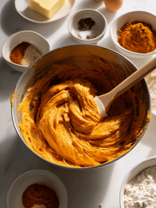 - Measure out pumpkin puree, brown sugar, and softened butter into a large mixing bowl. Mix with an electric mixer or whisk until smooth and creamy, filling your kitchen with a warm, spiced aroma.