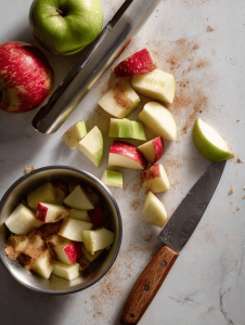 - Peel, core, and chop the apples into rough chunks. Toss them with a sprinkle of cinnamon and a teaspoon of sugar—this helps caramelize their edges as they bake.