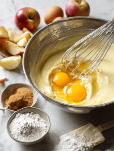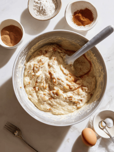 - In a separate bowl, whisk together the flour, cinnamon, baking powder, and salt. Gradually fold this dry mixture into the wet batter, stirring gently to keep it tender and airy.