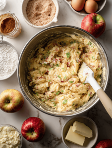 - Gently fold the chopped apples into the batter, ensuring the chunks are evenly distributed. The batter will look thick with speckled bits of fruit throughout.