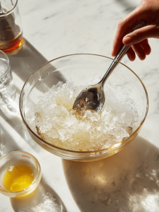 - Add the crushed ice to the bowl, then stir gently to combine everything evenly. The mixture should begin to feel cold and start to look slightly cloudy.
