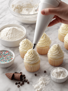 9. Pipe a generous swirl of frosting onto each cooled cupcake using a piping bag fitted with a large star tip. This creates a fluffy, inviting top.