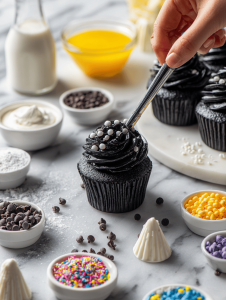 8. Prepare your buttercream frosting by beating softened butter until creamy, then gradually add confectioners' sugar, vanilla, and a few drops of black gel food coloring until you achieve a deep, glossy black color and fluffy consistency.